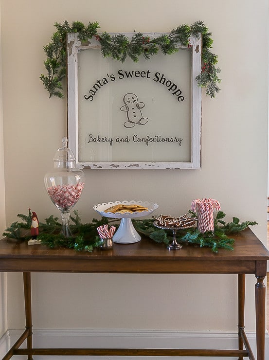 I haven’t gone full-on into the farmhouse/shabby look, but I think a little chippiness can work just about anywhere. Especially on a Santa’s Sweet Shoppe bakery window.