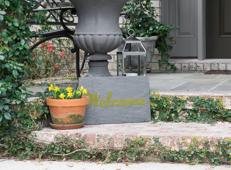 Spring front porch ideas for decorating using DIY spring crafts and greenery to create a beautiful front porch – capping off my spring porch ideas with a Cricut-made welcome sign.