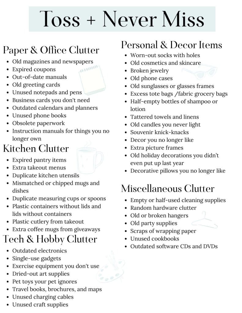 - Use it as a Quick-Start Tool. If you’re feeling overwhelmed by clutter, use this list to dip your toes in. Choose just one or two categories to tackle today and see how satisfying it feels to lighten the load.