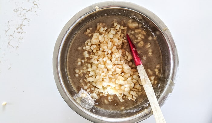 - Pour wet ingredients over the dry ingredients, along with the diced apples. Gently mix together