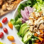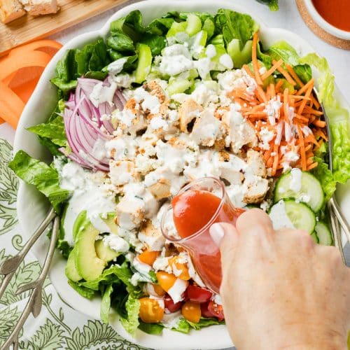 - In a large bowl or 4-6 individual bowls, place the lettuce, chopped vegetables, avocado, and chopped chicken. Optional: add blue cheese crumbles. Drizzle the prepared dressing as well as a drizzle of hot sauce over the top to taste and enjoy!