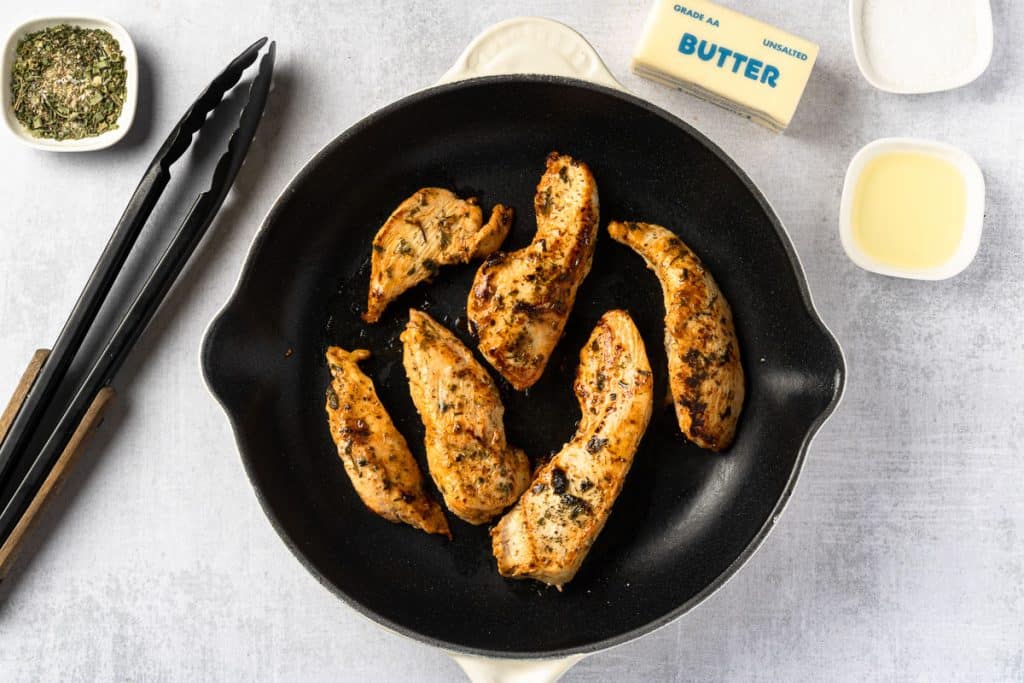 - In a medium or large pan, over medium heat, place 1 tablespoon of butter and 1 tablespoon of oil. Place the chicken in the pan once the butter and oil have melted and cook the chicken for 5-7 minutes on each side or until the internal temperature is 165°F. You may need to cook the chicken in batches to prevent overcrowding.