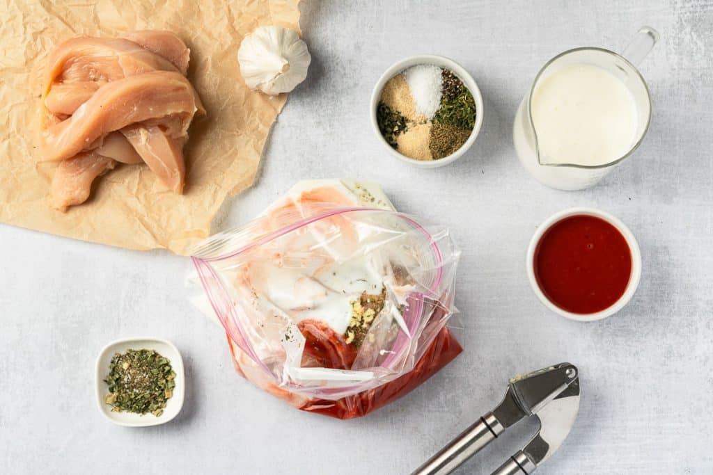 - Place the chicken in a large ziplock type bag or glass container with a lid. Add the marinade ingredients (½ cup of hot sauce, 1 ½ cups buttermilk, 2 pressed garlic cloves, 1 teaspoon of ranch seasoning, and 1 teaspoon of salt) to the chicken . If using a bag, close the top and squish the contents around until the chicken is covered with the mix and the mix is incorporated. If using a bowl, mix the contents together until incorporated and chicken is covered and place the lid on the bowl. Place in the refrigerator until ready to use.