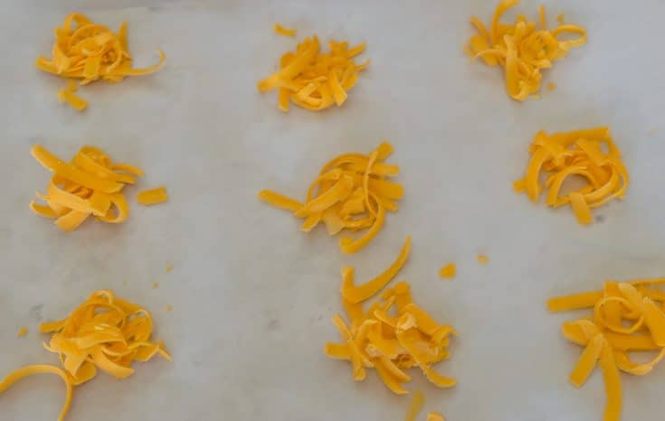 - Place 12 little mounds (tablespoon full) of cheddar cheese on parchment lined baking sheet.