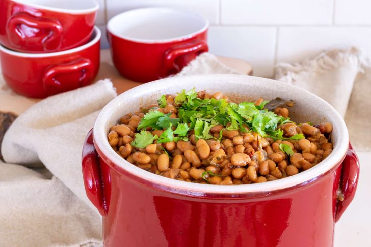 For a quick lunch, top the pinto beans with some queso fresco or Monterey Jack and scallions. And when mashed, these crock pot pinto beans fill in for refried beans alongside your tacos or inside quesadillas or burritos.