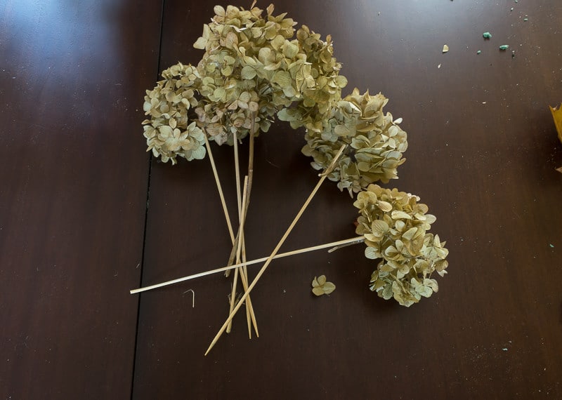 Then it was time for the ‘fluff’ of the hydrangeas. Once again, I extended the height of some of my hydrangea bunches by taping them onto the bamboo skewers.
