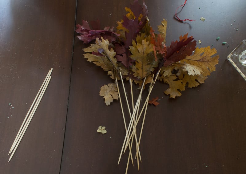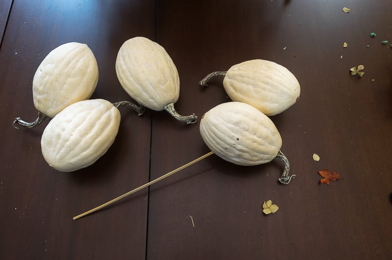 The next element, the focal point, are the white gourds. I poked the skewers in random places around the gourds so that they presented at different angles.