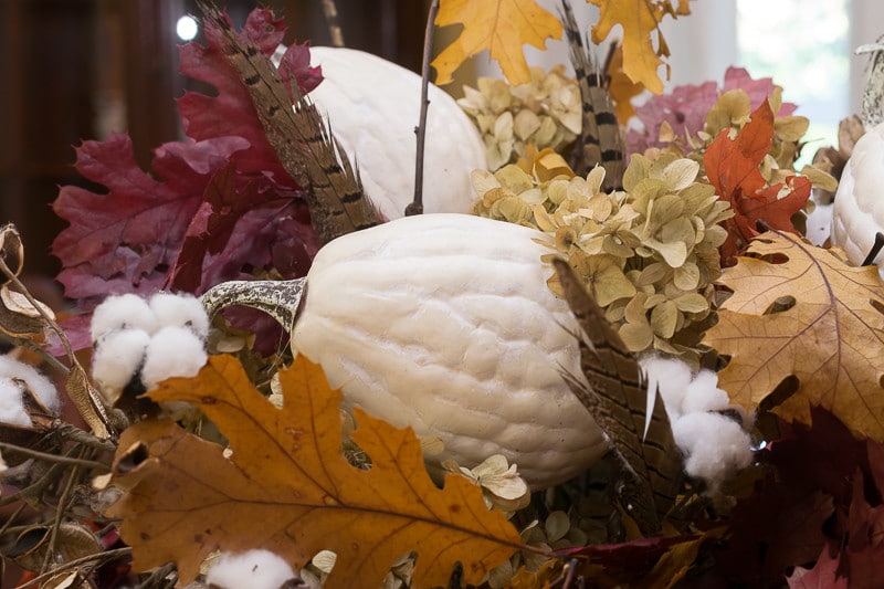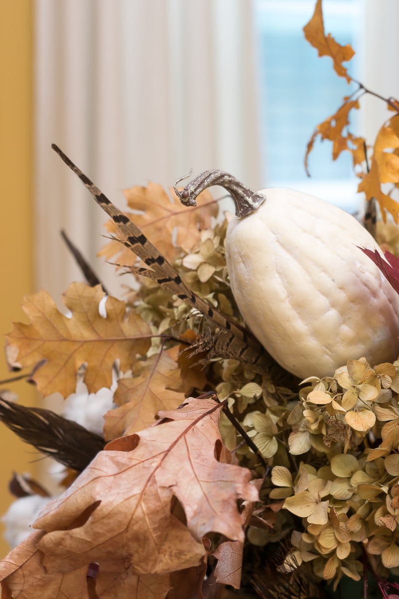 When it came time to put together a long-lasting fall centerpiece for my dining room table, I fell back to the ‘neutral and natural’ feel that I was channeling in the rest of our home. I picked up some more cotton branches and white gourds and was able to use some branches, dried hydrangea, and feathers that were already up in my attic.