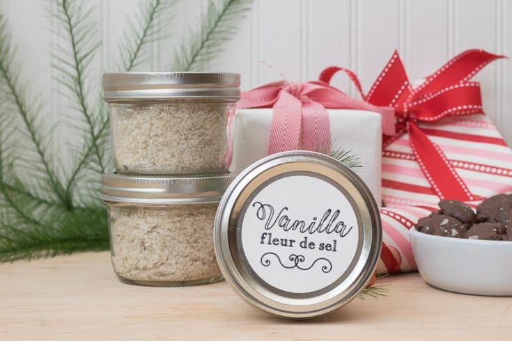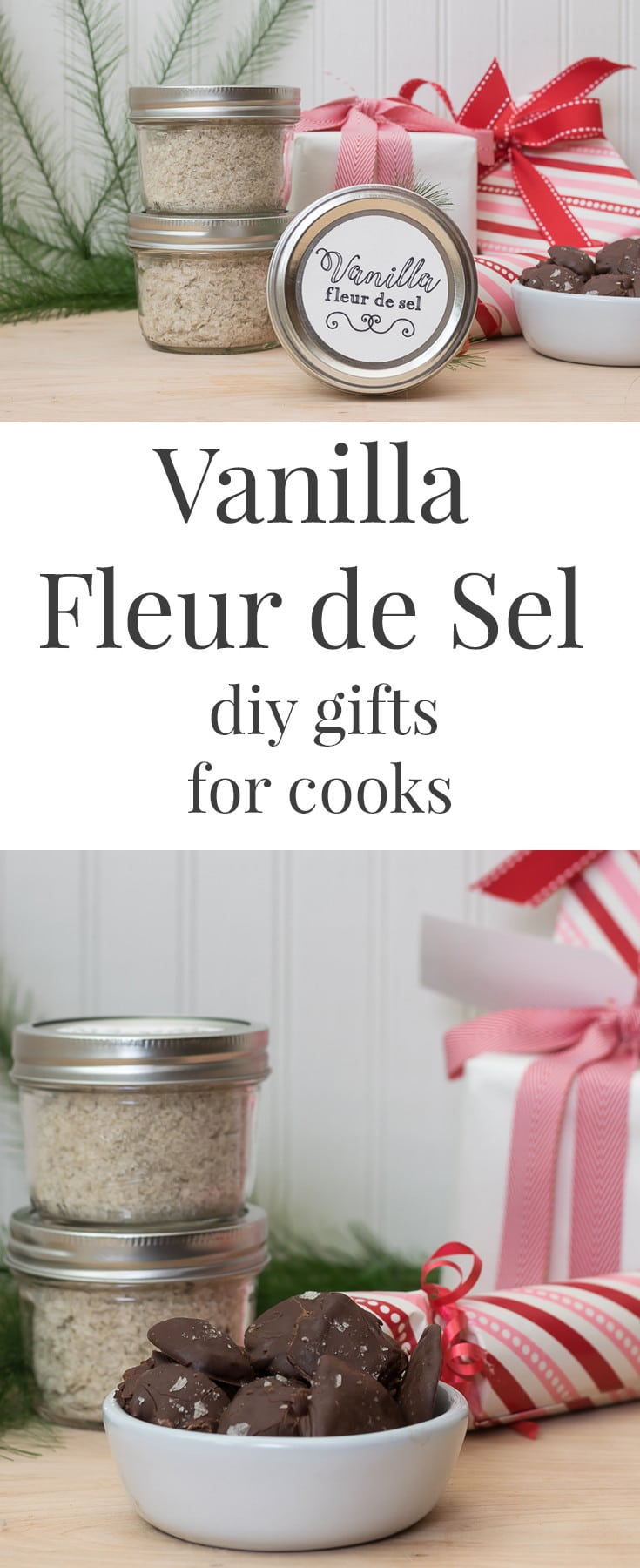 It all started with these Chocolate Covered Vanilla Fleur de Sel Caramels. I was starting to plan which treats we would be making this Christmas and decided I’d give this recipe a try. It’s been in my recipe binder for years, but I never made it because I didn’t have the requisite Vanilla Fleur de Sel. So that got me thinking, “what exactly is vanilla fleur de sel?” and then “surely I can make my own”. I had the vanilla beans and a bag of Fleur de Sel. This was just the beginning of my adventures of making DIY gifts for cooks.