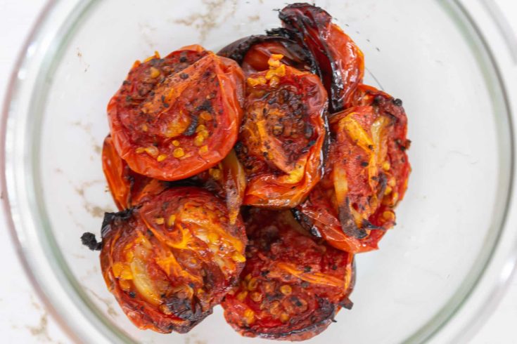 Grilling the tomatoes over high heat gives them a bit of char, which is the trademark of fire-roasted tomatoes. We turn them halfway during grilling to ensure that both sides get the char. Fire-roasting tomatoes on the grill results in a tomato with a smokier flavor compared to roasting in the oven.