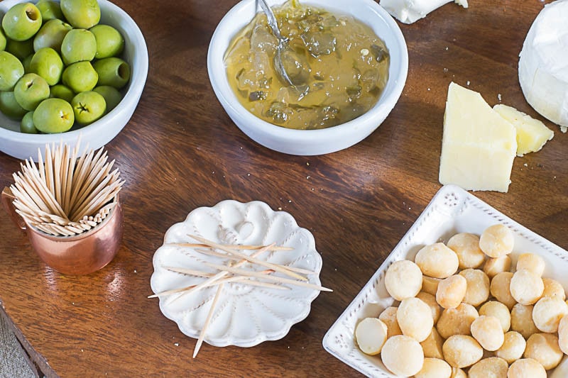 - Olives, Pickles, etc… On this tray, we just had plain Castelvetrano olives. But if you want to take it up a notch, marinate them.