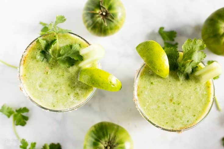 Simple 5-Minute Homemade Green Bloody Mary Mix makes a unique cocktail base. Just blend together green tomatoes, tomatillos, celery, cilantro, green hot sauce and spices.