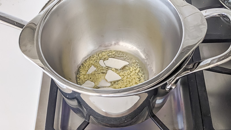 - Put double boiler bowl into pot, over the simmering water. The cocoa butter and beeswax should melt in about 5 minutes.