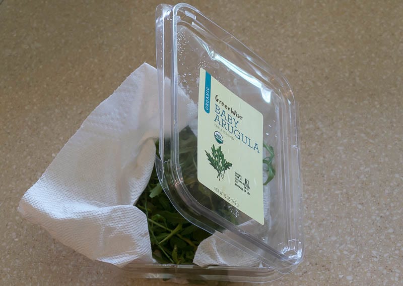 - If you buy your leafy greens in a plastic tub, take them out of the tub, wrap them loosely in a paper towel, and then return them to the plastic tub. The paper towel will absorb any unwanted moisture.