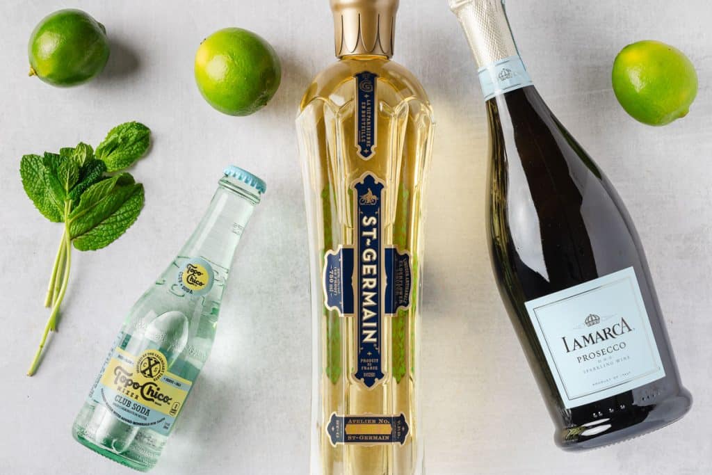 You can prep the muddled mint, elderflower liqueur, and lime slices ahead of time. Just don’t add the Prosecco or club soda until serving to keep the bubbles fresh.
