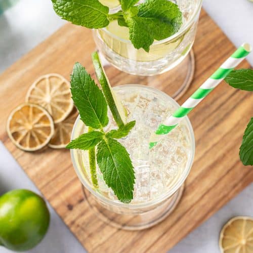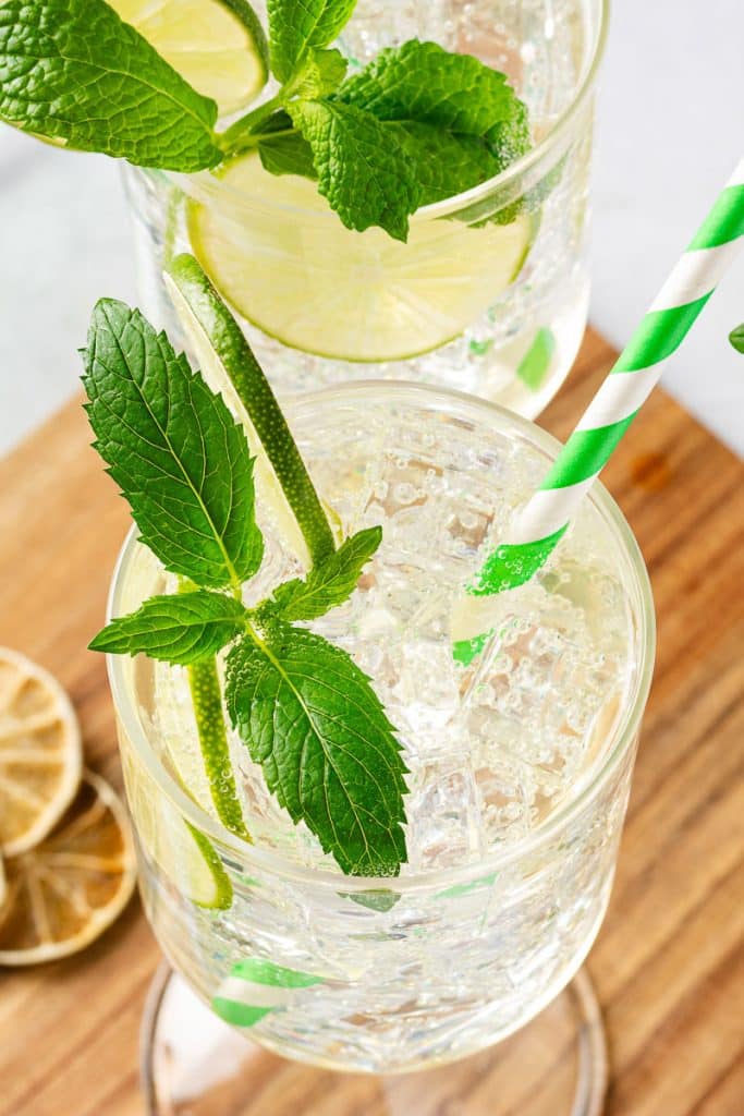 - Add some ice cubes if using and garnish with a lime slice and mint sprigs.