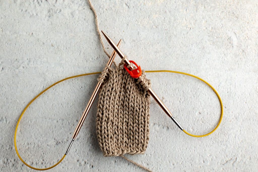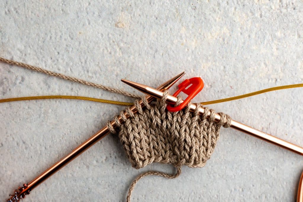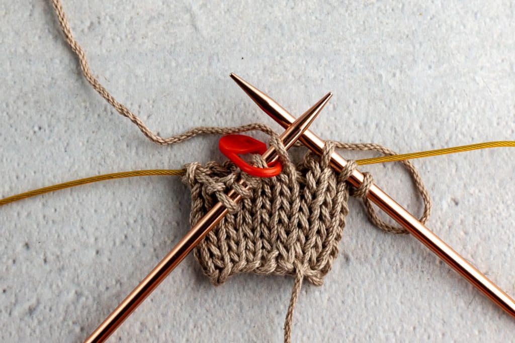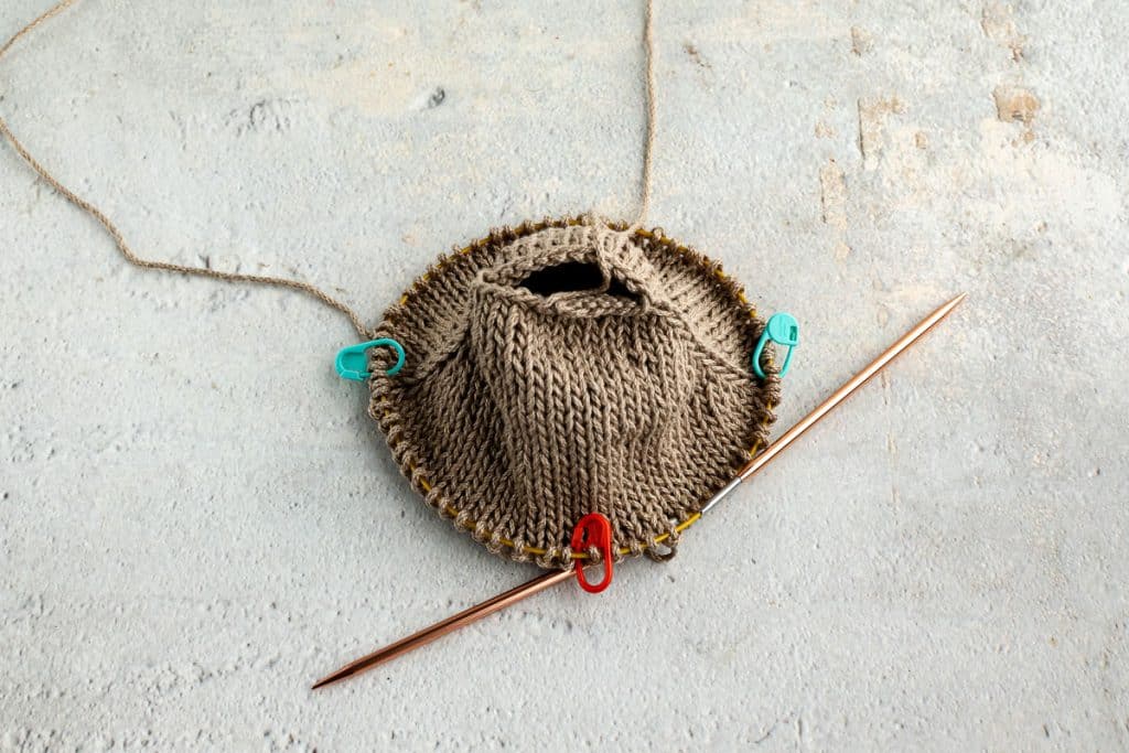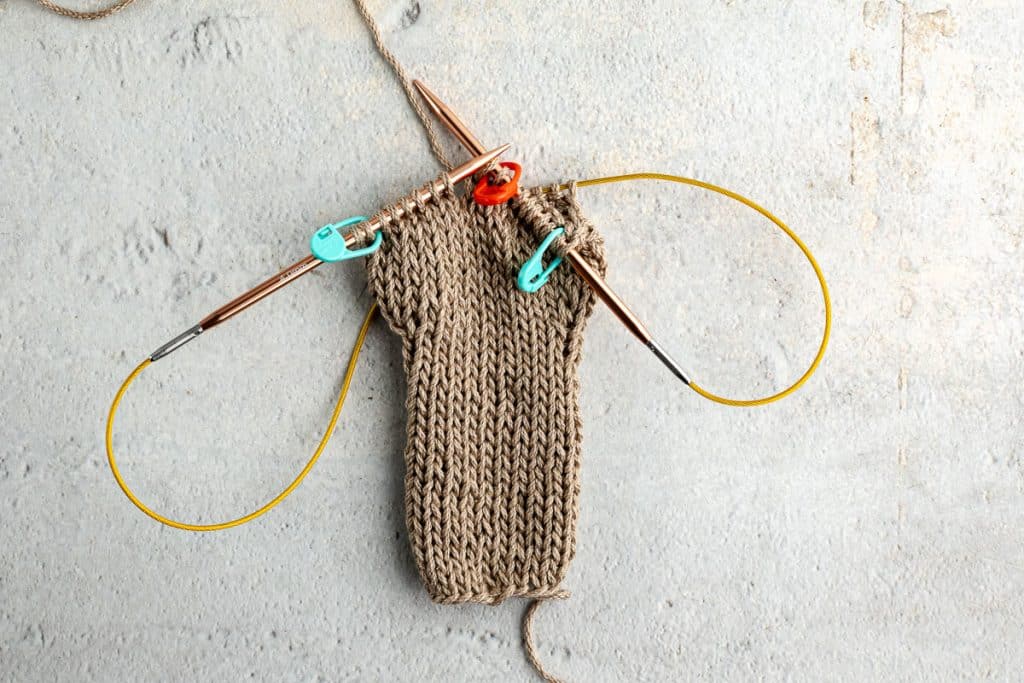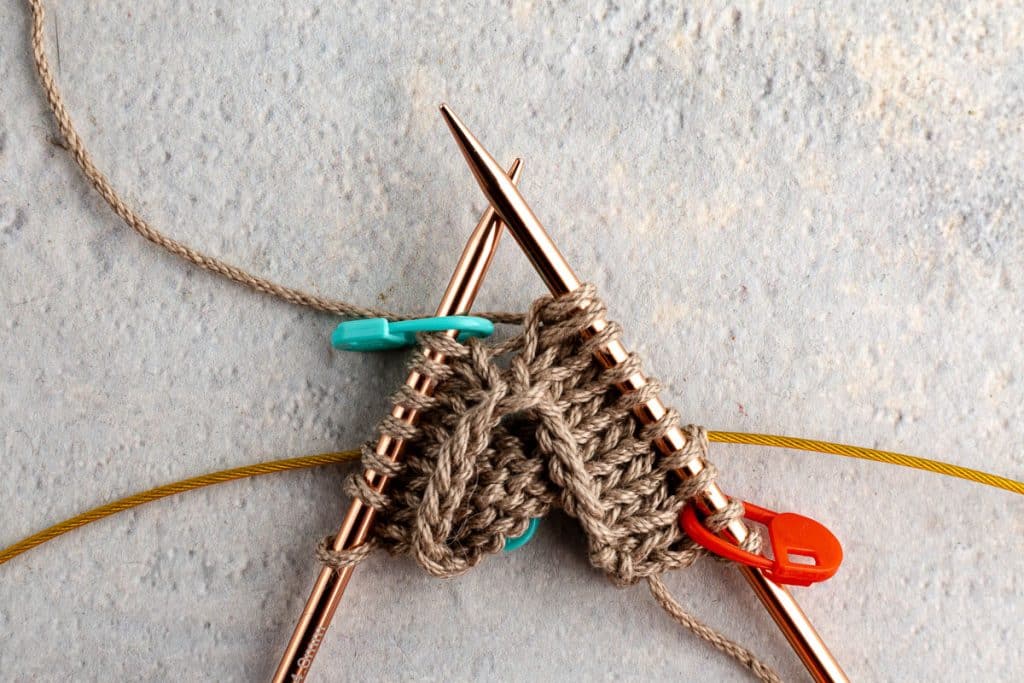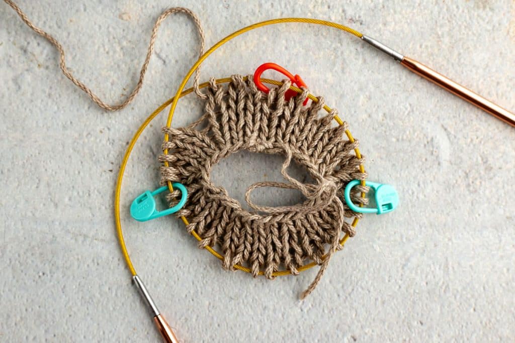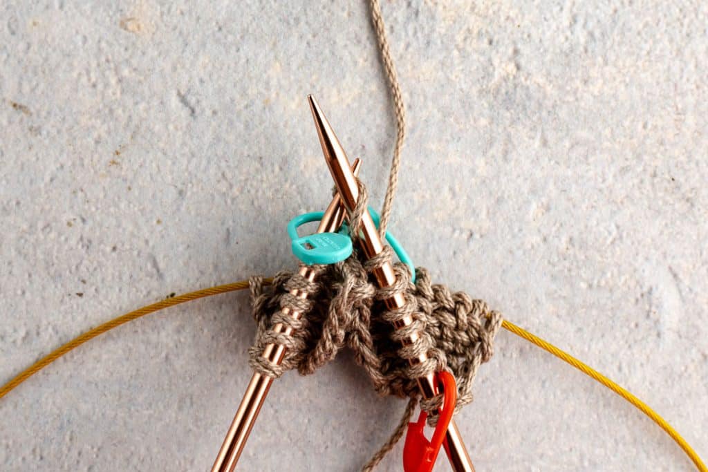 - Round A: Knit to 1 stitch before each side SM, iLinc, slip SM, iLinc, for a total of 4 increases per round.