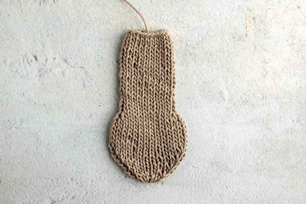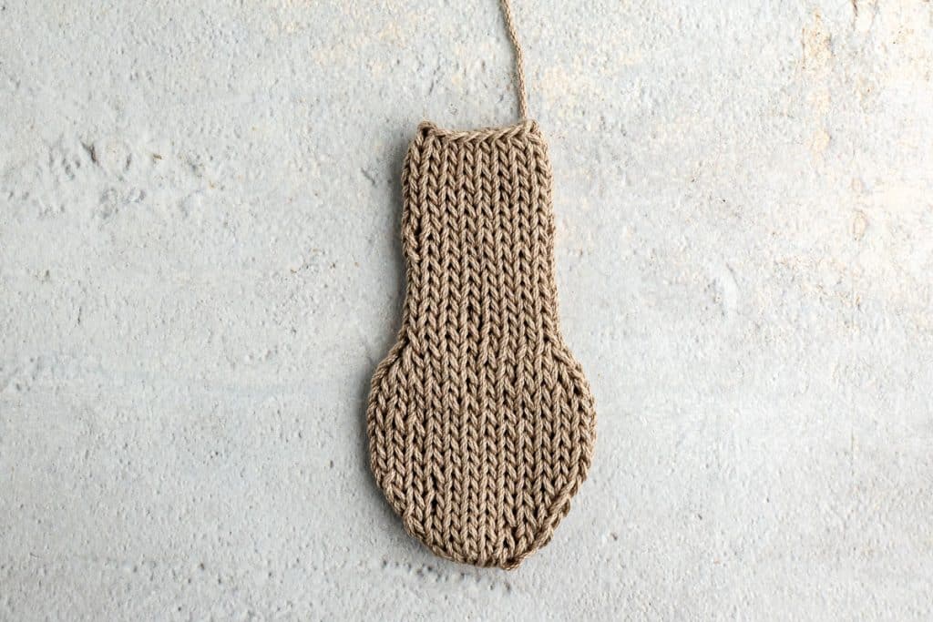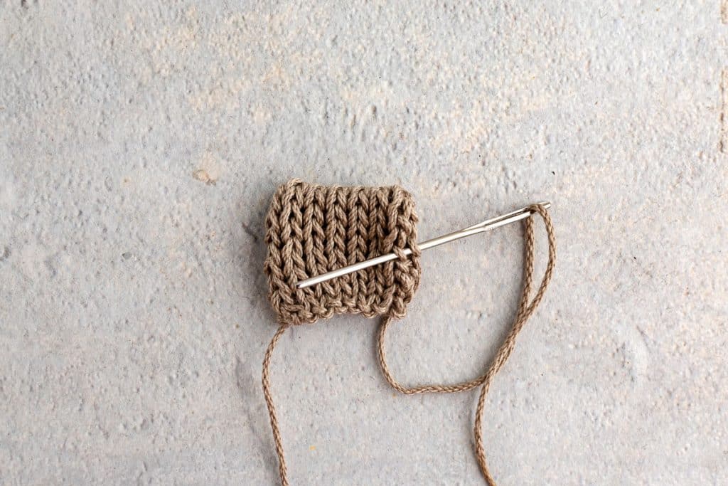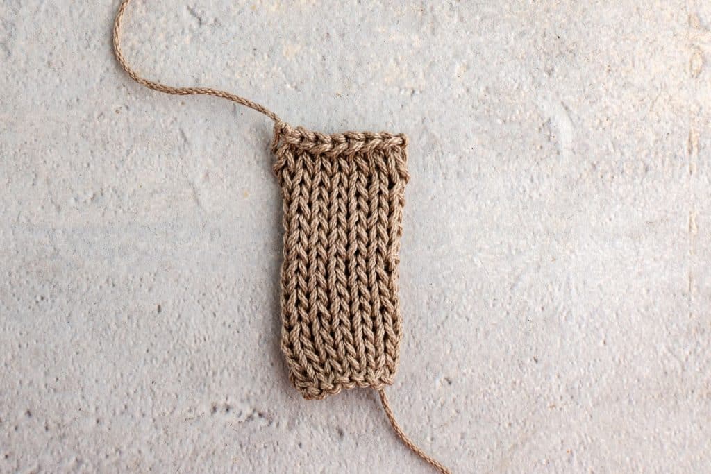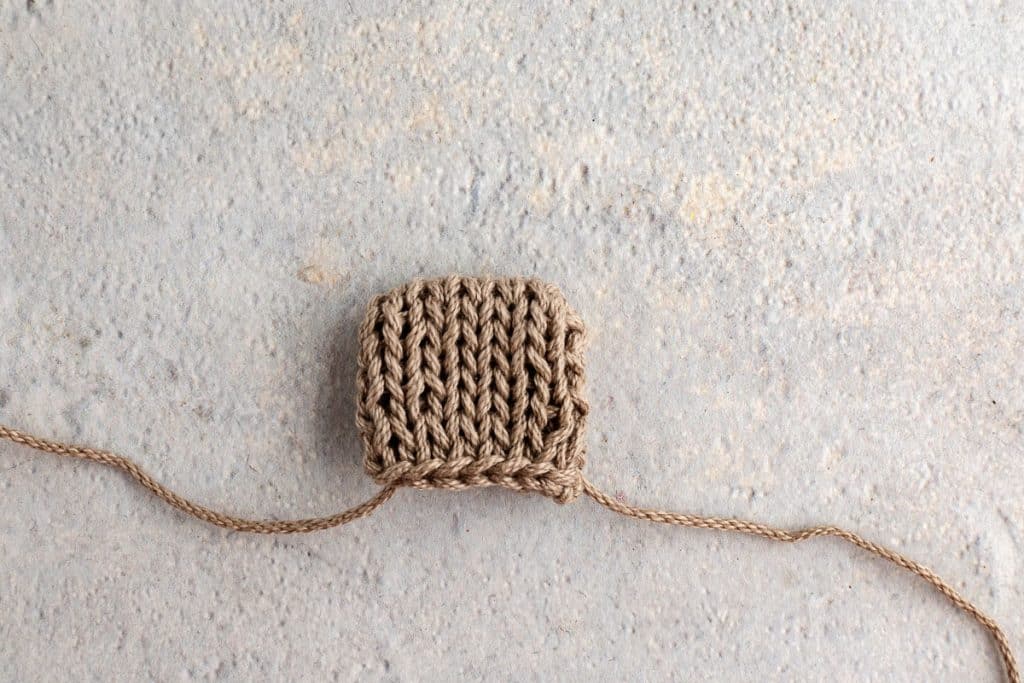 - Work in stockinette stitch for 14 rows. Bind off. Leave tails on the bottom-right and top-left corners for sewing.