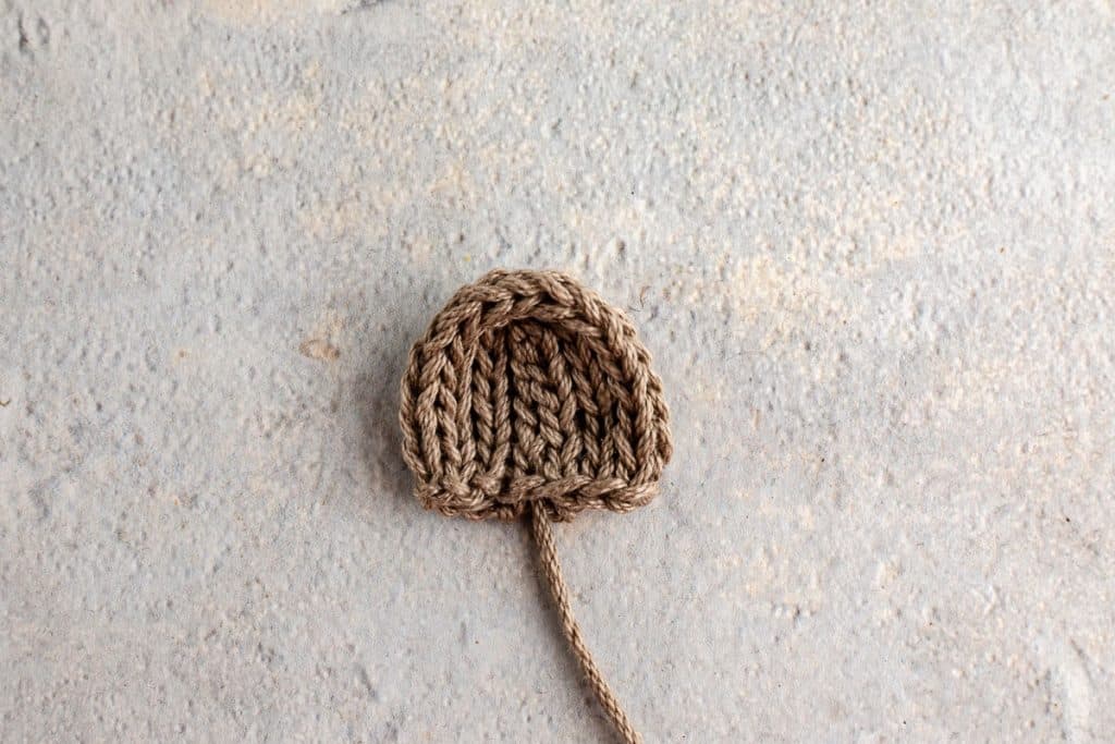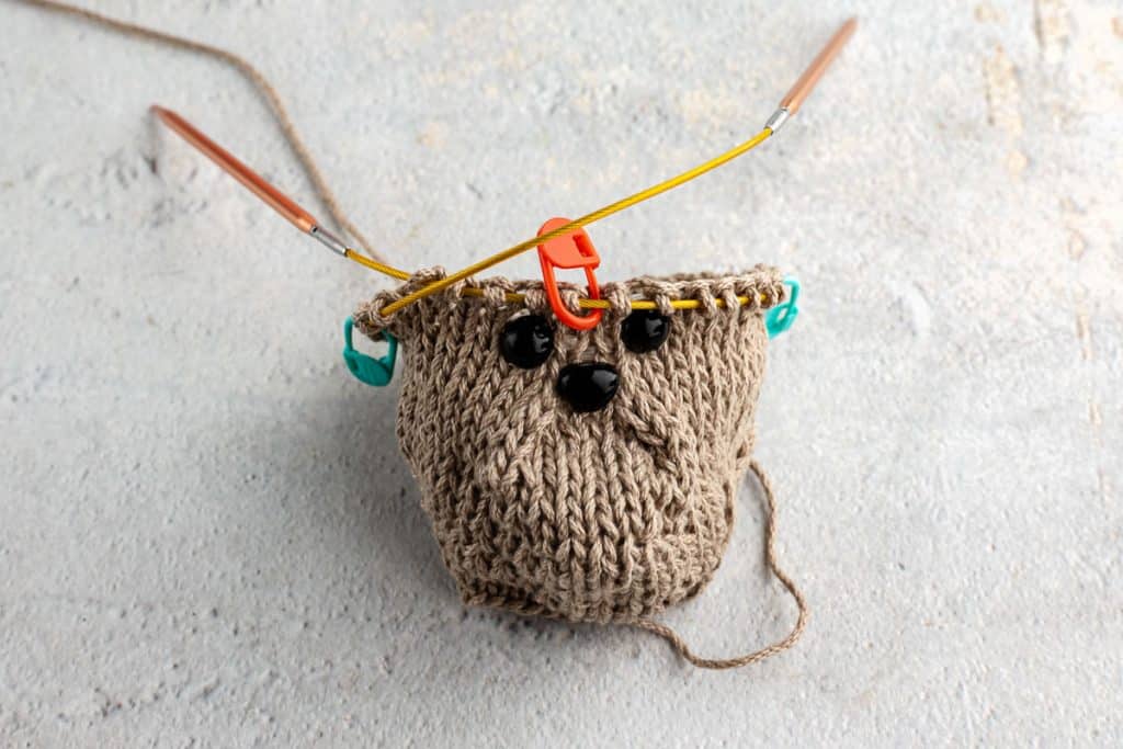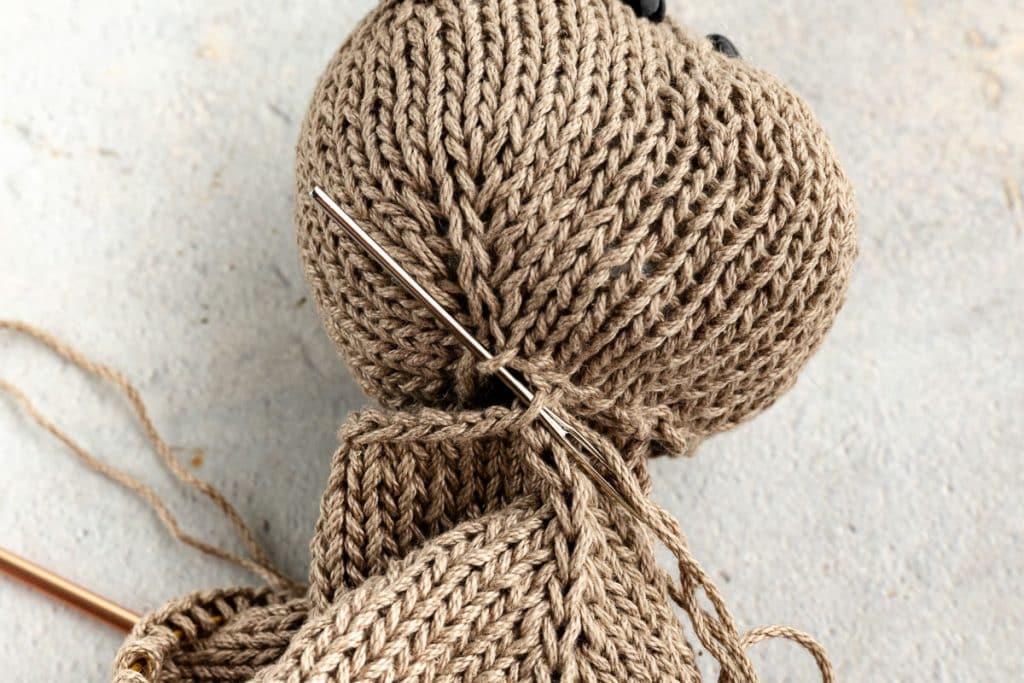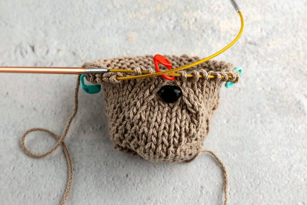 In this section, we transition from knitting in the round to knitting flat to create the snout using German Short Rows. So, every time we turn, we start a new row, but we only work on the front section of the face.