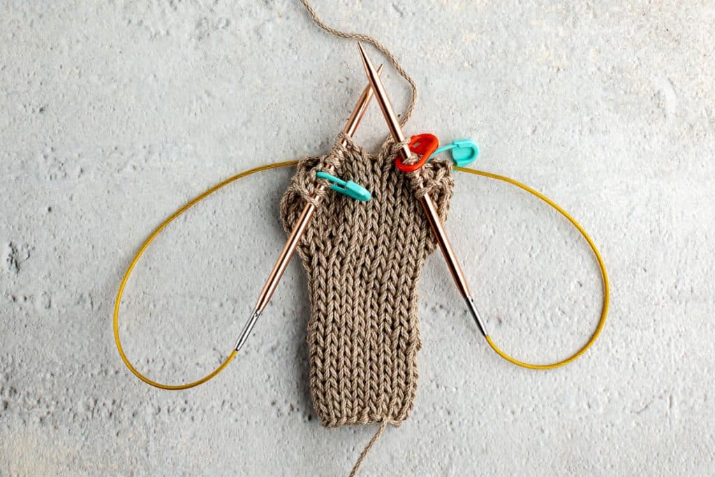 - Mark 4 stitches on either side of the center for the front and back, using 2 stitch markers.