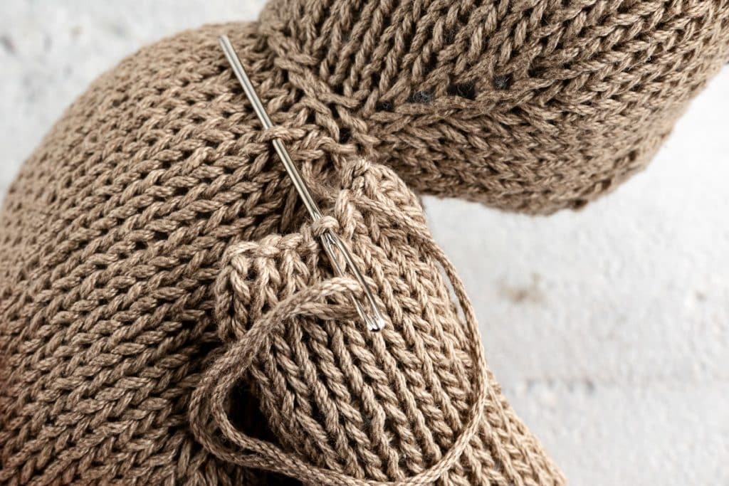 Used to close up small circular openings, like the top of the head or the bottoms of the limbs. Thread a tapestry needle with the yarn tail and run it through the remaining live stitches. Pull the yarn tight, like a drawstring, and secure it on the inside. - Mattress Stitch