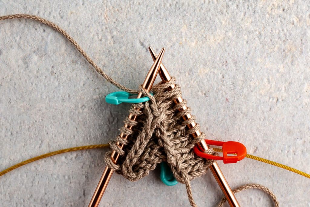 Having two different colors of stitch markers is helpful in this case. Use one color for the first stitch marker and then another color for the two other stitch markers, as shown below.