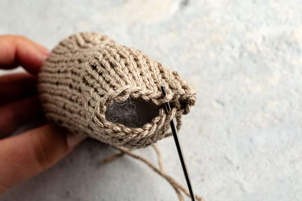 - Line up seams and mattress stitch across 24 stitches. Begin to stuff the top half of the body lightly.