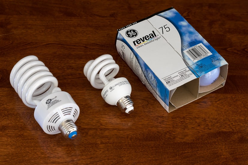 - Lightbulbs…this is where it got interesting. For my photo above, I used a bulb marketed for photography. It’s a CFL 50W bulb, equivalent to 250 watts and balanced for pure white light. However, for this post, I played around with several other bulbs to show you the different outcomes, a GE Energy Smart 20W CFL and a GE Reveal 75W Traditional Bulb