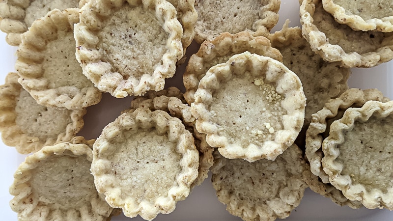 I opted for a pecan shortbread crust for these tartlets instead of the flaky crust associated with traditional pies to switch things up. As such, it’s a little thicker, a little heartier than your traditional pie crust.