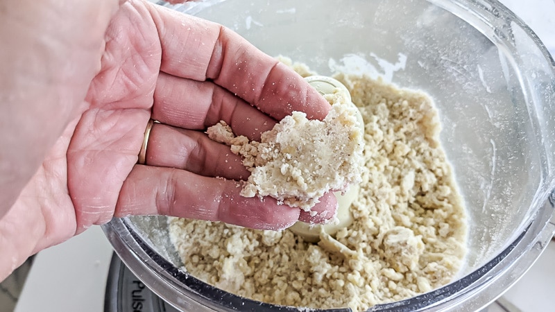 - Add egg and vanilla and keep pulsing until the dough is no longer dry and starts to clump together for about 10-15 seconds. Do not process to the point that a large ball of dough is formed. Instead, the dough should still be crumbly with some large clumps. You can test by taking a piece of dough and pressing it between your thumbs. The dough should stick without feeling dry or crumbly.