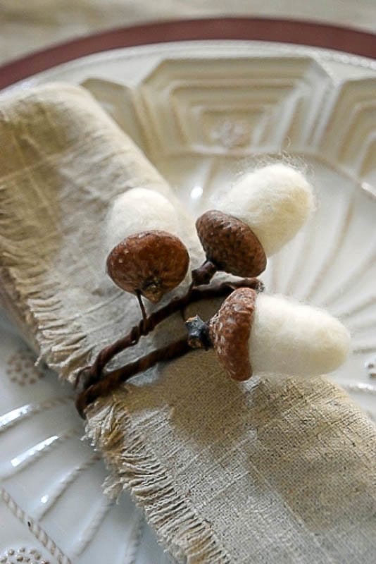 So that’s that…needle felted acorns to fill a bowl or Needle Felted Acorn Napkin Rings for your fall or Thanksgiving table.  You can see how I fringed my linen tablecloth and napkins here.