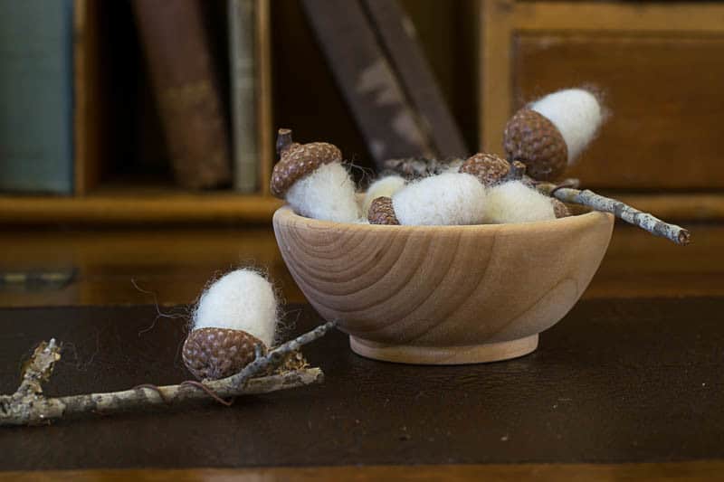 Needle felting is one of those simple crafts that I love to pull out from time to time.  These needle-felted acorns were the first needle felting project I did on my own, and I am always so happy when I unpack the ‘fall’ box and spy these little guys. They are a great fall adornment in a bowl on their own, wired to a branch, or as lovely needle-felted acorn napkin rings for a fall table.