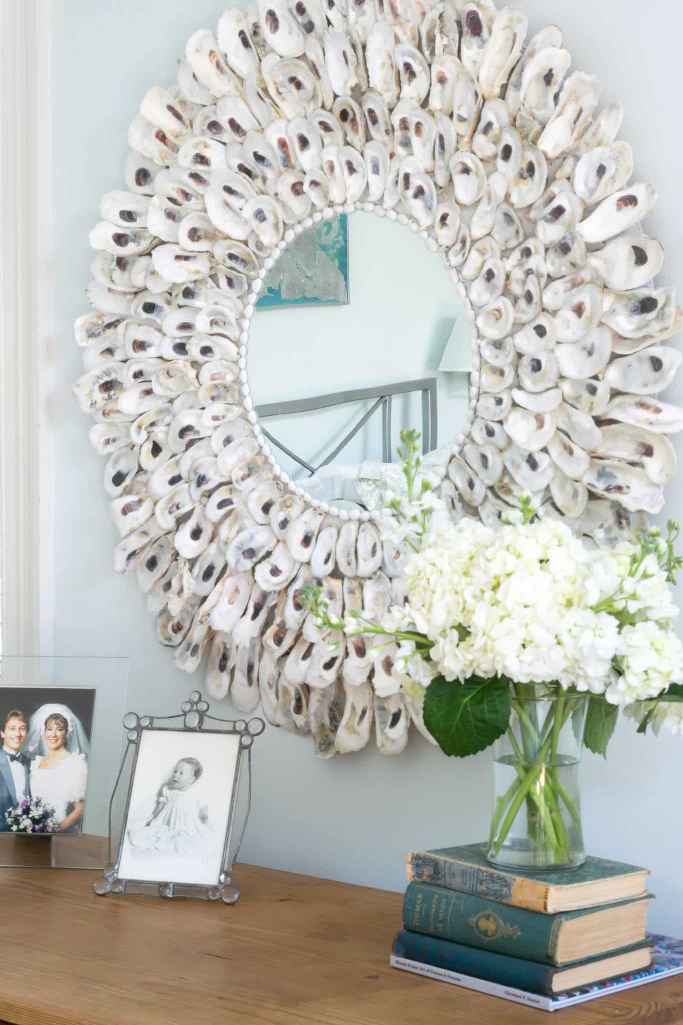 I’ve lived on the ocean almost all of my life, and I’m all about bringing it inside wherever I can, but in a way that feels intentional rather than kitschy. This Oyster Shell Mirror is exactly that — a round wooden base, a center mirror, and oyster shells arranged from smallest to largest, radiating outward into something you would pay serious money for in a boutique. This is one of my all-time favorite DIYs and hangs in my foyer right now.