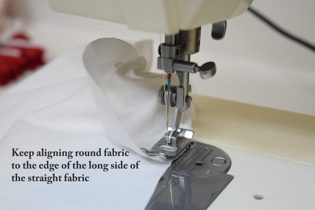 Sew the bottom/base of the bag to the side of the bag. Slowly stitch, moving the bottom circle to align as much as possible with the straight edge of your fabric. Because a picture is worth a thousand words, see the video below to better illustrate what you need to do.