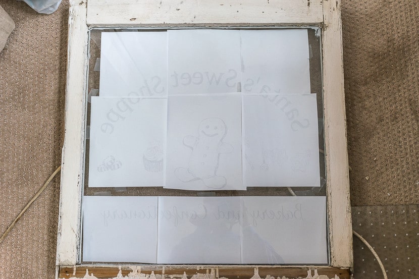 - To paint your window, tape your design in place on the front of your window. Once it’s in place, turn the window over. Place a towel or something between the design and your surface so that the papers are pushed up against the glass. This will make it easier to follow your design.