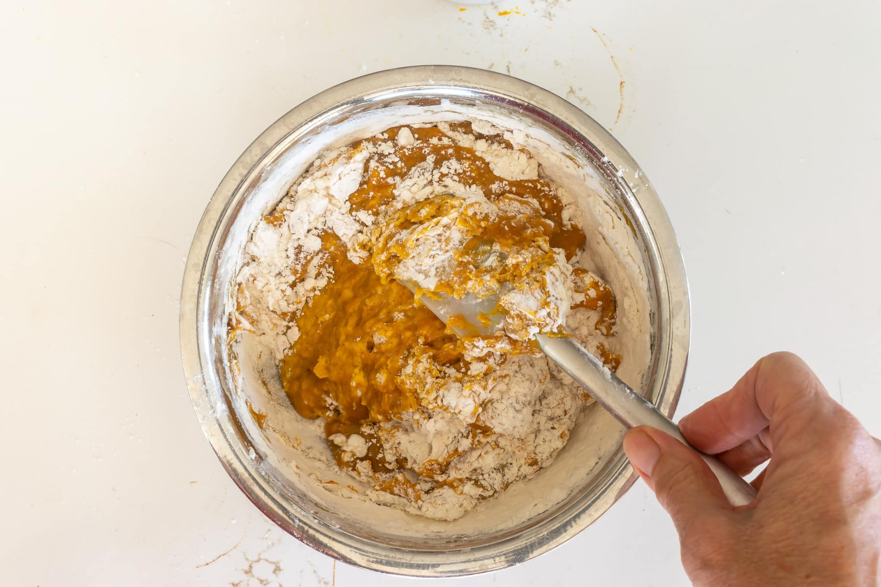 - Add flour mixture to pumpkin mixture and fold until just combined.