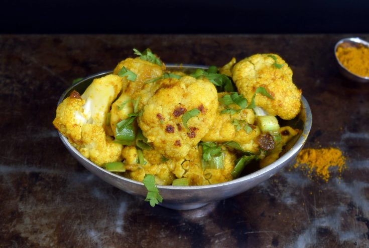 I have been in a ‘clean out the refrigerator’ mode with our vacation looming. As such, I have been hesitant to buy anything at the grocery store for the past couple of weeks, opting instead to work with what we had on hand. We’ve been having a lot of one-off meals, meaning that there’s enough to feed one person. But I am slowly accomplishing my goal of an empty-ish refrigerator. Often times, I find that the adage ‘necessity is the mother of invention’ is absolutely true in the kitchen. When not pushed to do otherwise, we tend to fall in with our old favorites. This Roasted Curry Cauliflower Salad is the perfect example. I’m not even sure why I had this head of cauliflower in the refrigerator or when I bought it…in all honesty, its best day had recently passed. But we were having these Indian-inspired grilled chicken skewers for dinner and I wanted a vegetable in addition to our green salad, so it was kismet.