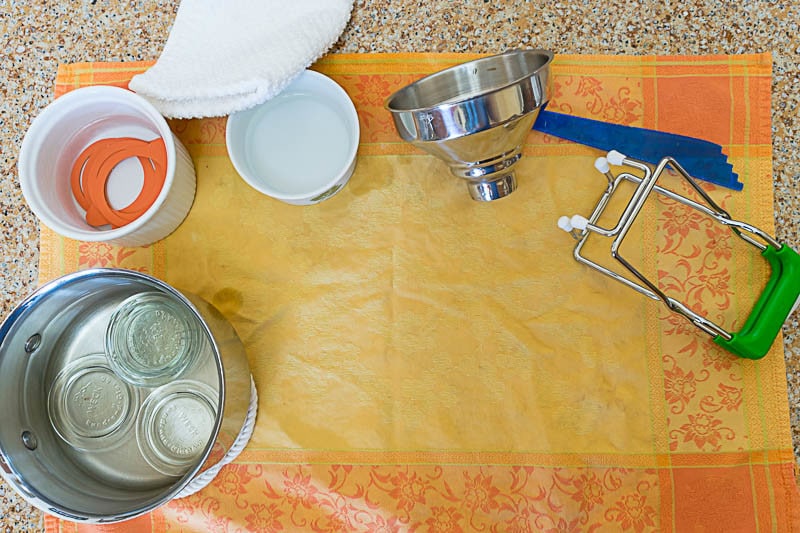 - Prepare canner, jars, and lids. See The Ball Complete Book of Home Preserving for guidance. Lay out a clean towel, along with a small bowl of white vinegar (to wipe off rims) and your canning supplies on a clean counter.