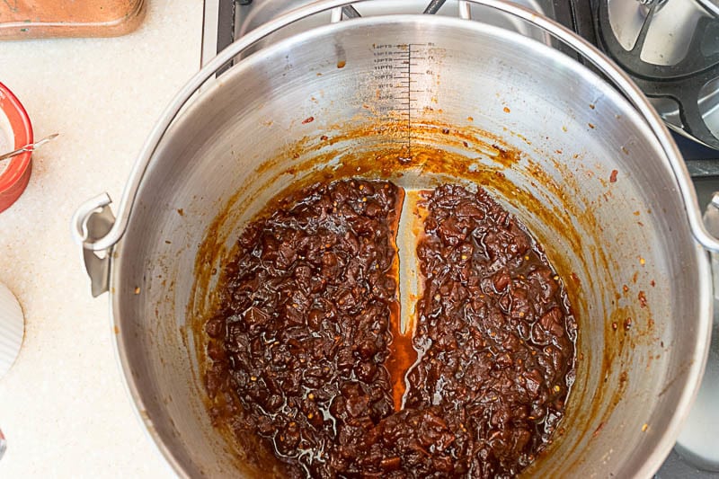 - Simmer the jam, stirring frequently until it reduces such that you can run a spoon through it and the jam doesn’t quickly fill the void left by the spoon. This will take approximately 2 hours. I had to turn on and off the heat when I couldn’t watch it and mine took closer to 3.5 hours.