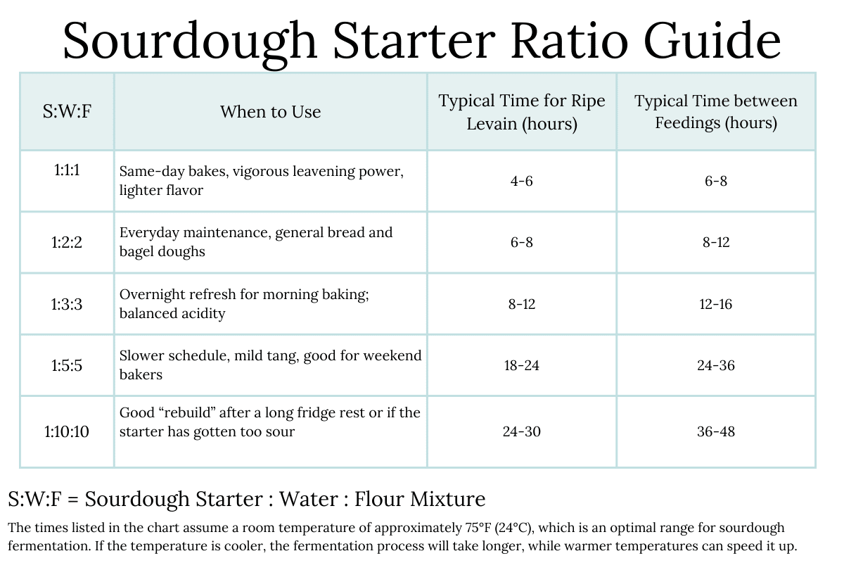 - Use your sourdough starter at its bubbly peak. If it is sluggish, give it an extra feeding and a warm spot to revive it. This post has some tips on boosting your starter. Here’s a chart that helps determine how to feed your starter to get it where you want it to be. This is just a guideline, as every starter’s environment (water, room temperature, flour, etc.) differs.