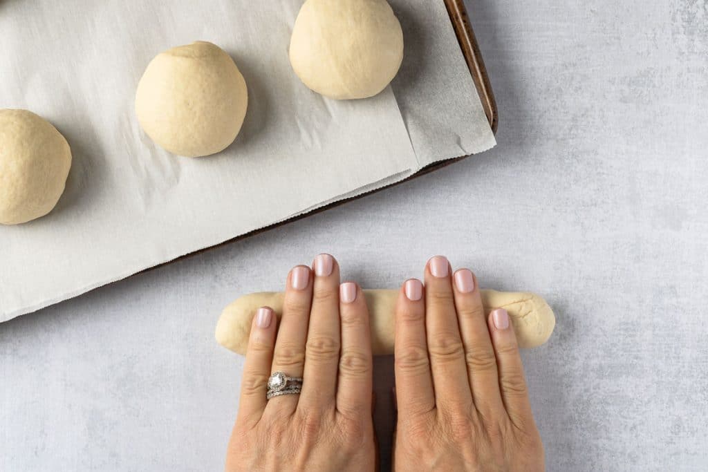 Roll each ball into a rope or log shape. To help develop tension in the dough, roll each piece into a short rope, holding one end in place and rolling the other end back and forth, slightly stretching the rope as you go. The gentle elongation tightens the outer layer. The dough must be long enough to wrap a circle around your fingers, plus an inch or so, so the two ends can overlap slightly.