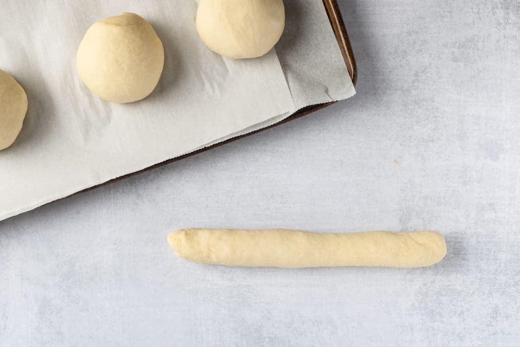 - Roll each ball into a rope or log shape. The dough will need to be long enough to wrap a circle around your fingers, plus an inch or so, so the 2 ends can overlap slightly.