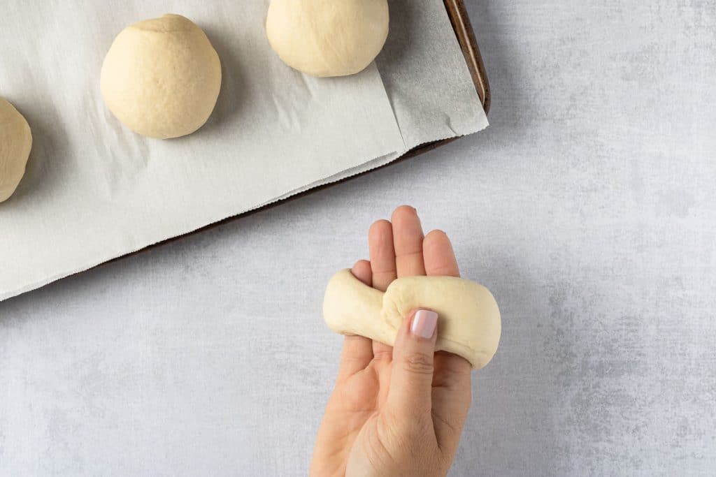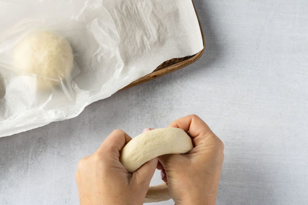 - 6 pm- Line a tray with parchment paper. Divide and form the dough into eight equal balls. Shape using one of the two methods shown below.