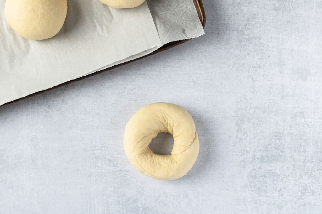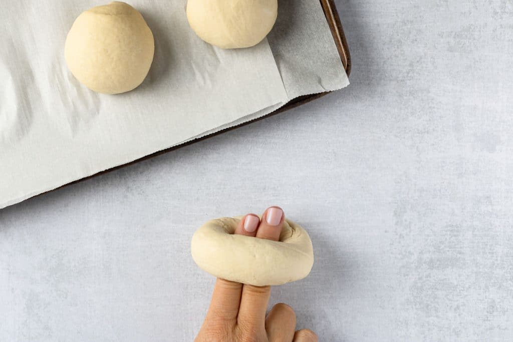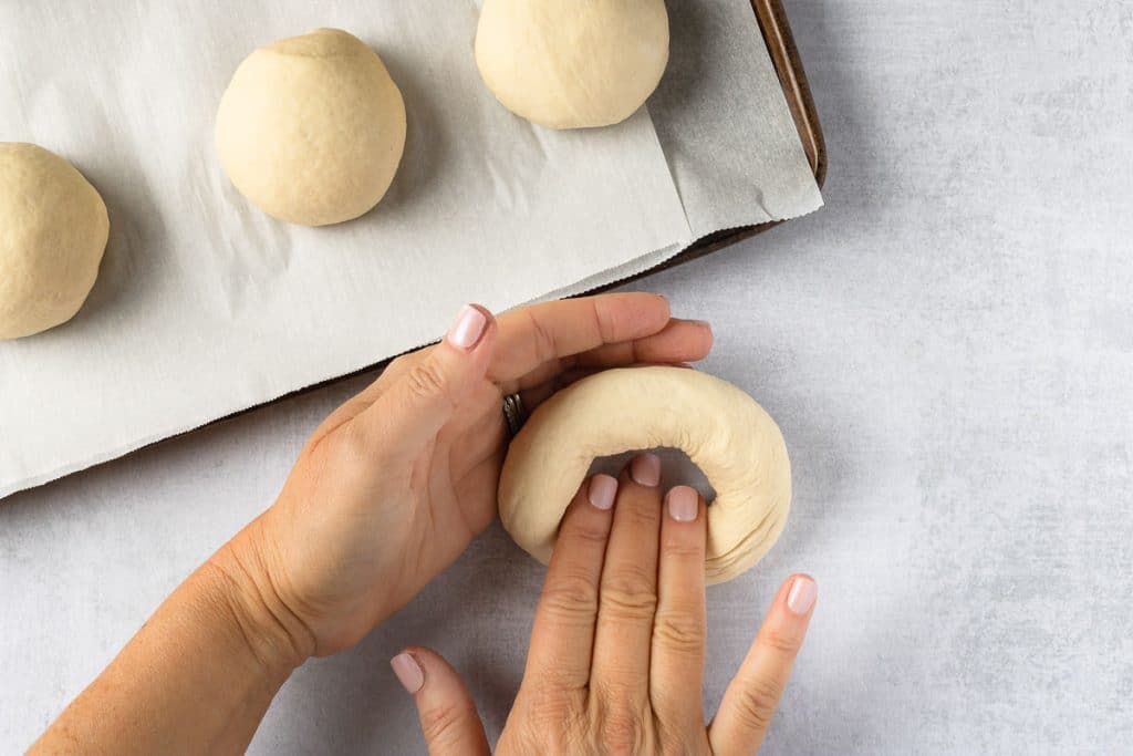 Gently stretch the dough to make a large ring. Work a little section at a time, around the ring, stretching the dough with both hands. Once pulled, the circle should fit around all the fingers on one hand. Remember that the hole in the center will shrink back down after resting and baking, so you don’t want it too small, or the hole will close when baking.
