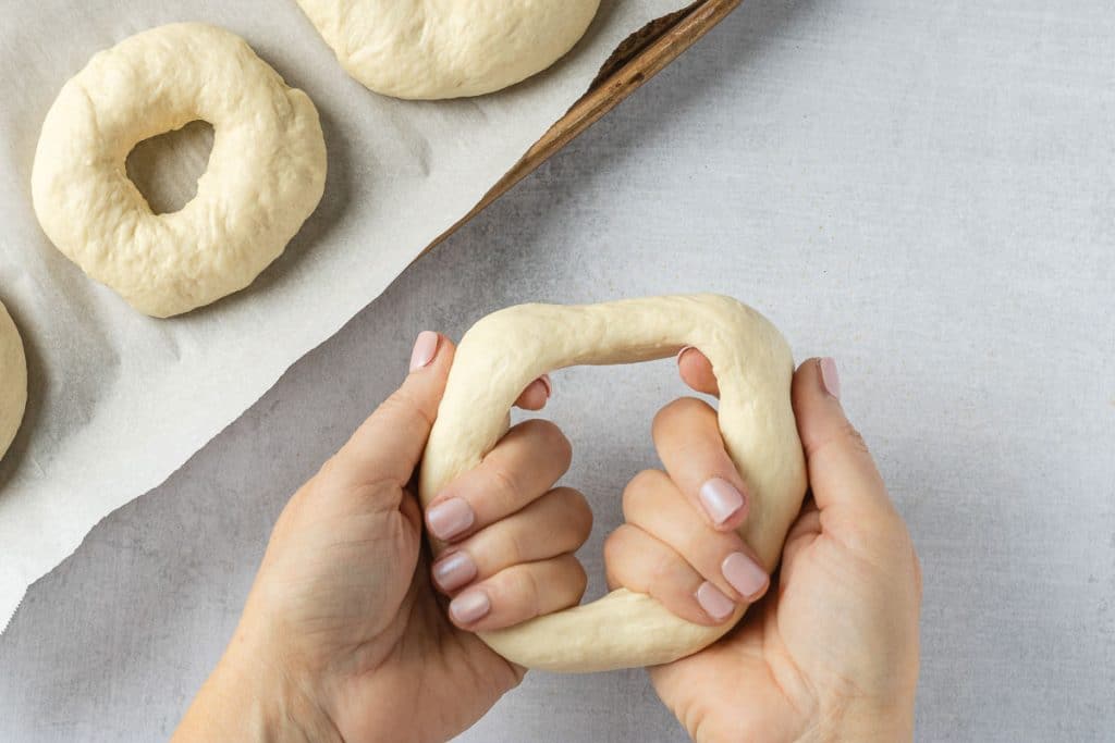 - When shaping the bagels using either method shown, skip the extra flour on your hands or work surface—friction is what tightens the dough. If sticking becomes an issue, a quick mist of water adds glide without changing the texture. Shape each ring briskly, because over‑handling lets the gluten relax and the surface slacken. You’ll know you’ve built good tension when the shaped bagel springs back after a light poke.