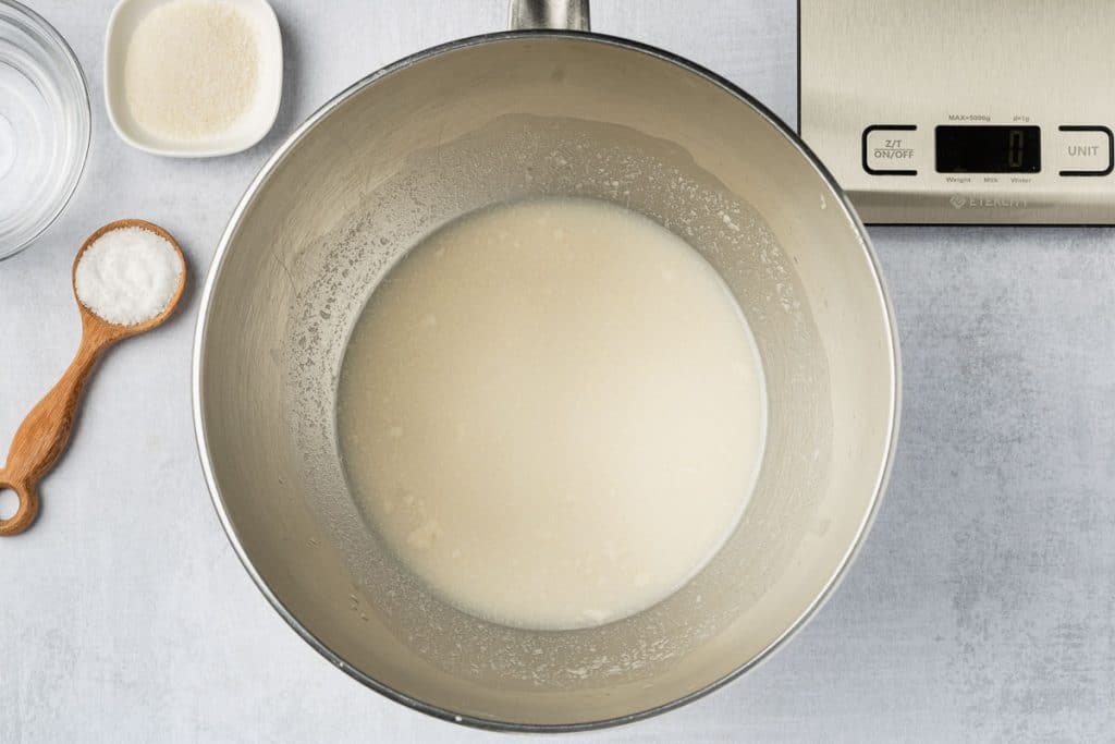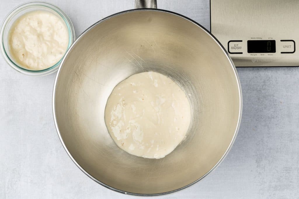 1. Combine sourdough starter, water, sugar, and salt in a mixing bowl.
