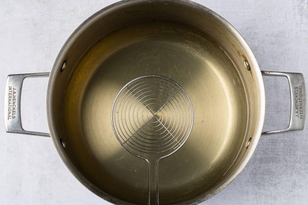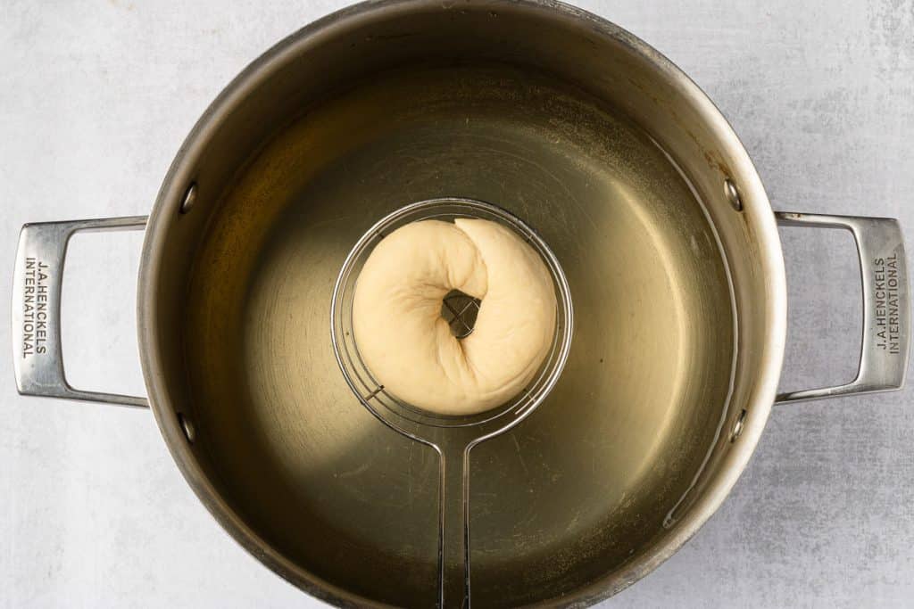 9. Place one test bagel in a spider strainer and gently add it to the water bath. If it floats within 10 seconds, you are good to continue. Boil the bagels for 60 seconds, 30 seconds on each side. It is easiest to boil no more than 2-3 at a time.