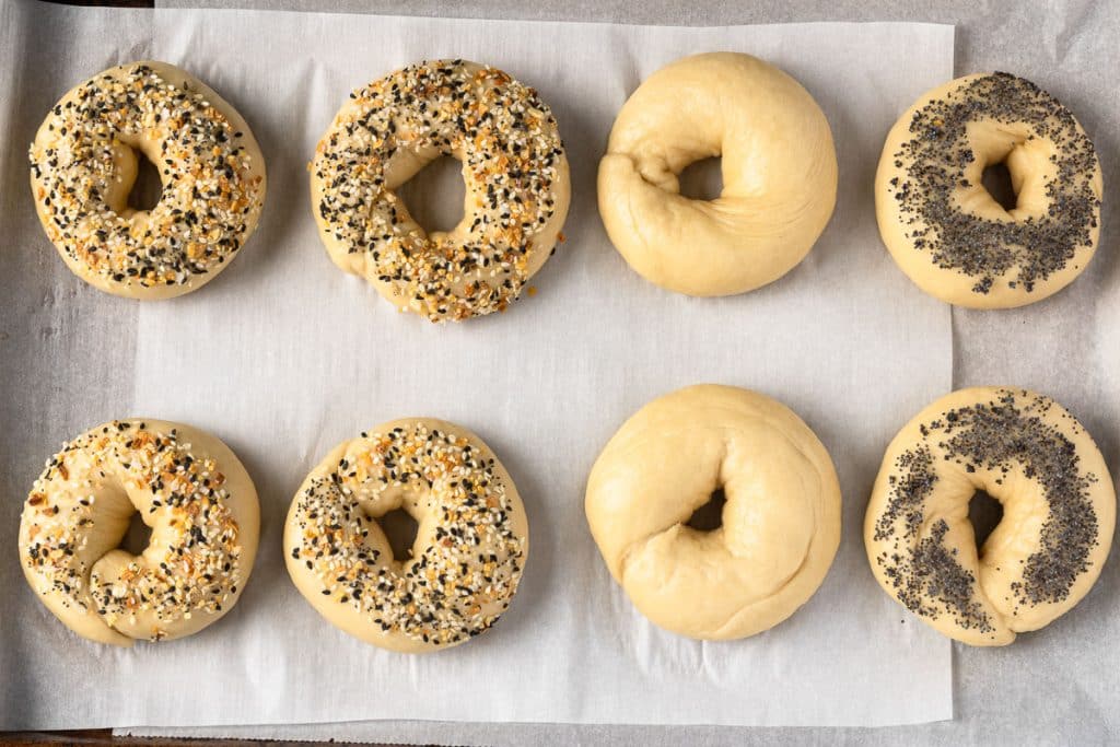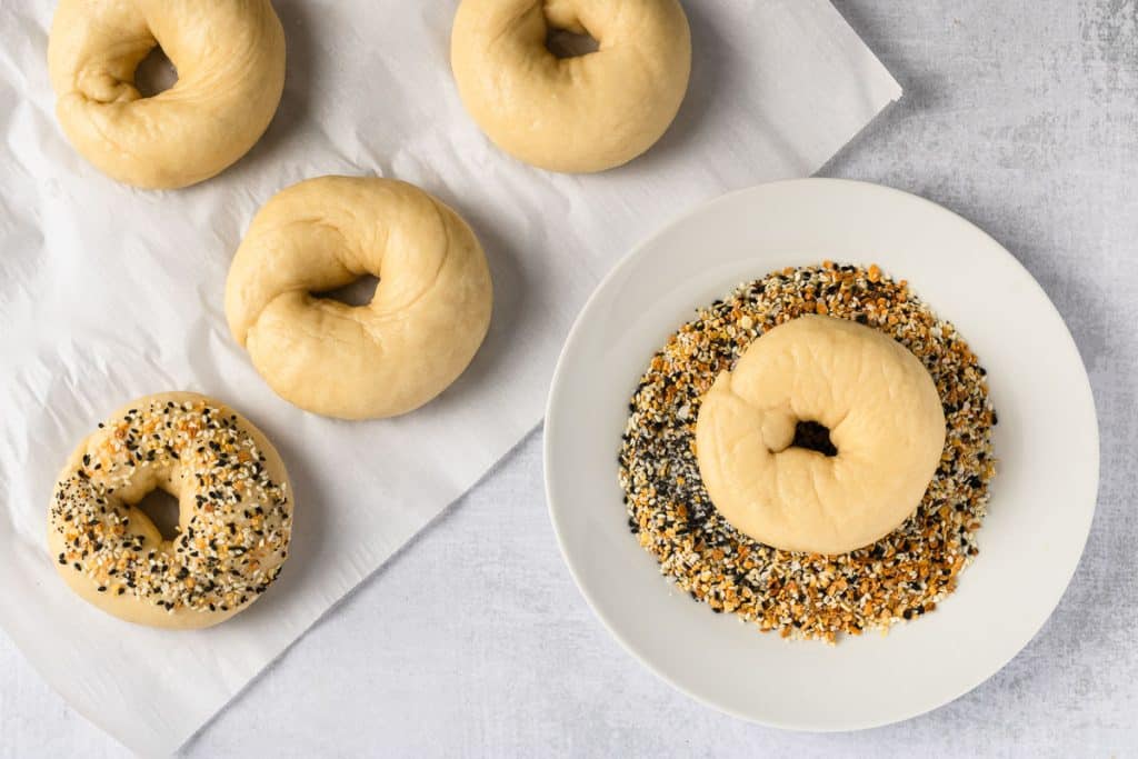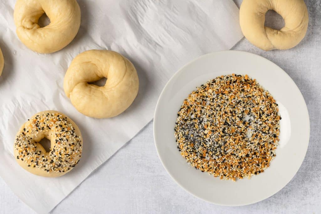 - Prepare the toppings, if using, by placing them in a shallow container for dipping. Also, prepare a second sheet of parchment to place the bagels on before baking.