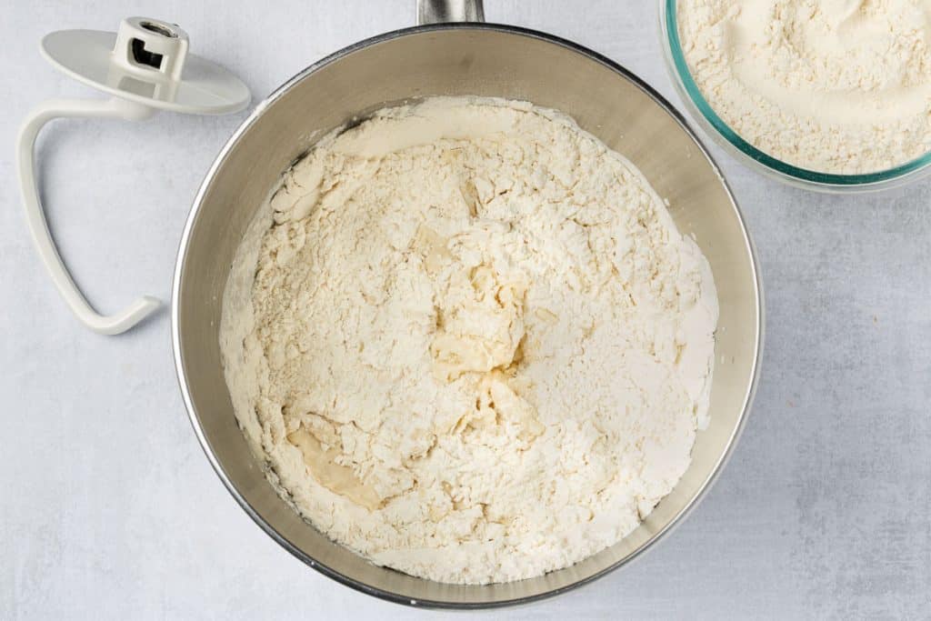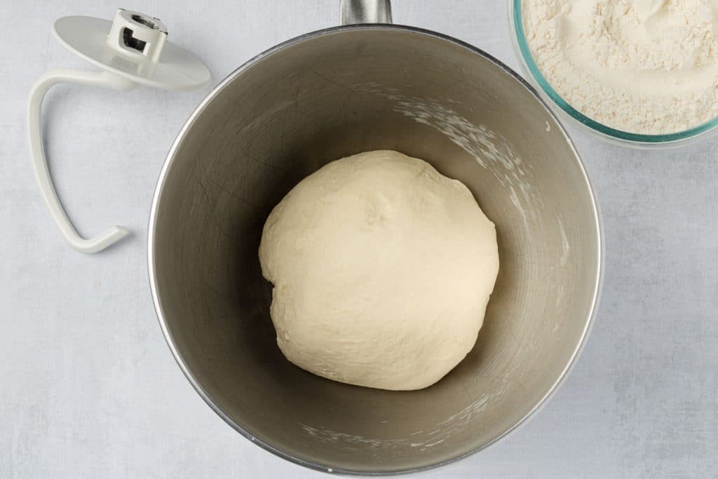 2. Using a dough hook, mix in bread flour. The dough will be stiff, but do not add more water. Mix on low, with the dough hook, for 6-7 minutes (or knead 10 minutes by hand).