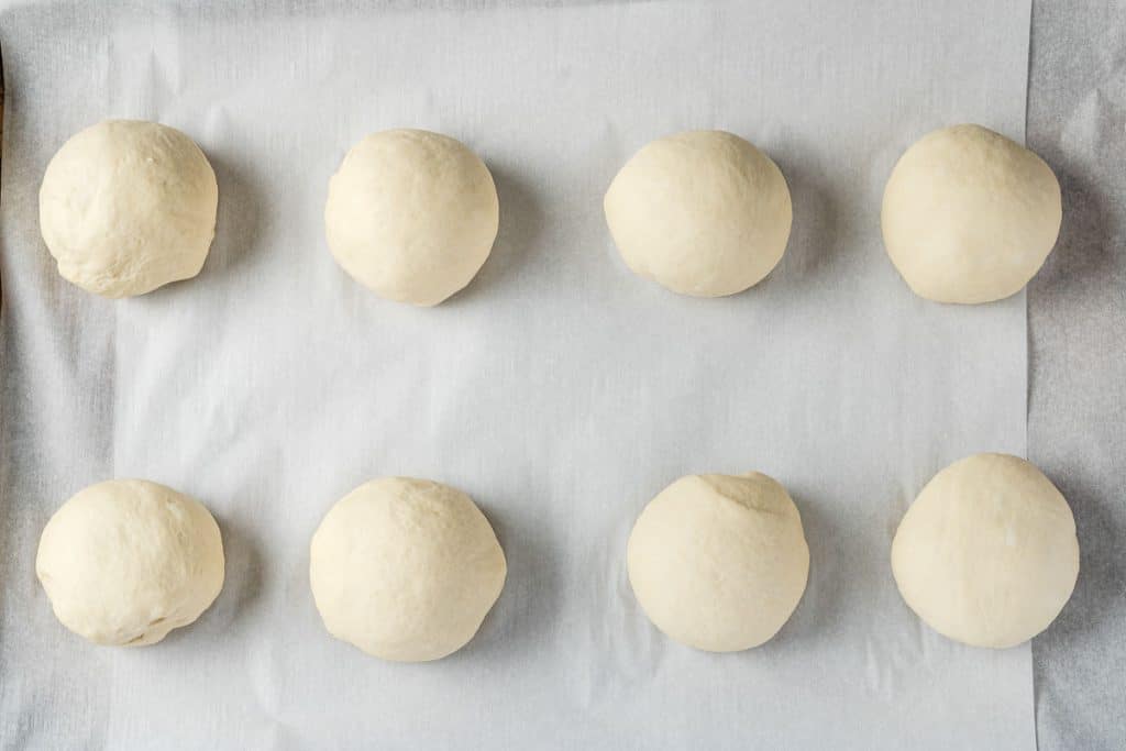 4. Line a baking sheet with parchment paper. Divide the dough into eight equal pieces and roll them into balls.